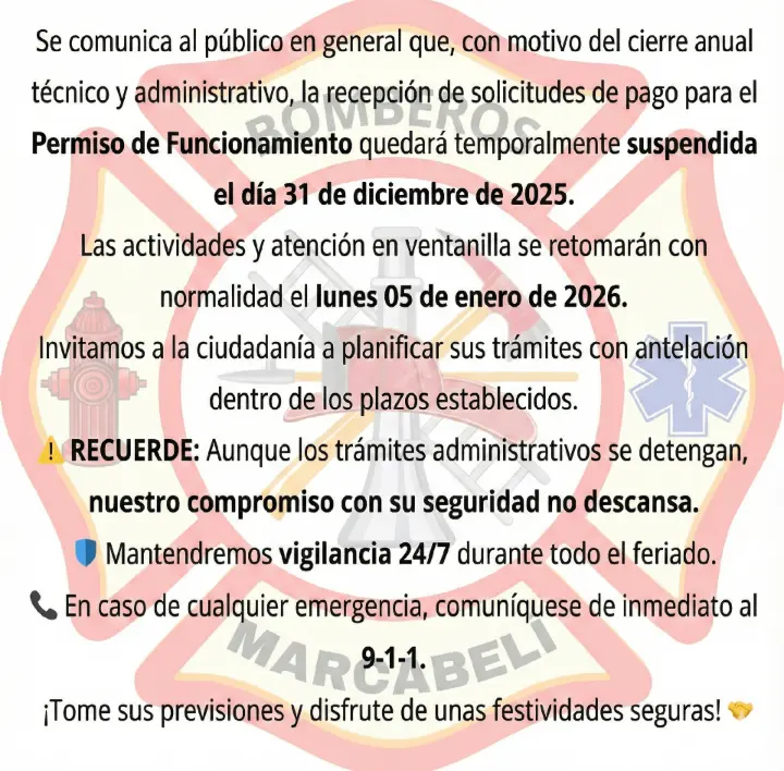Se acerca el fin de año y, con él, los necesarios cierres administrativos para preparar el nuevo periodo. El Cuerpo de Bomberos de Marcabelí ha emitido un comunicado oficial importante dirigido a toda la ciudadanía y, en especial, a los propietarios de negocios.
