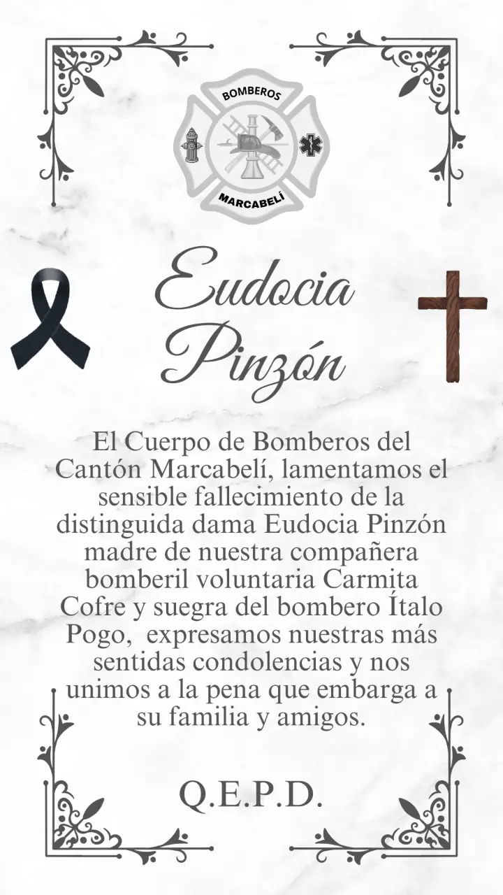 El Cuerpo de Bomberos del Cantón Marcabelí, lamentamos el sensible fallecimiento de la distinguida dama Eudocia Pinzón madre de nuestra compañera bomberil voluntaria Carmita Cofre y suegra del bombero Ítalo Pogo, expresamos nuestras más sentidas condolencias y nos unimos a la pena que embarga a su familia y amigos.